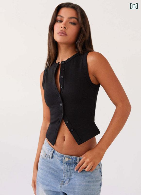 ・カテゴリ: Tシャツ・スタイル: ストリートカジュアル、欧米風・主な素材: 綿90~95%、スパンデックス5~10%・ネックライン: クルーネック・袖丈: ノースリーブ・柄: 無地・デザイン: 前開きボタン・フィット: スリム・着丈: 普通丈・製法: 立体裁断