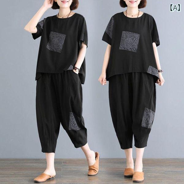 ・カテゴリ: カジュアルセットアップ・スタイル: きれいめカジュアル、フェミニン・性別: レディース・セット内容: パンツセットアップ・主な素材: ポリエステル50%〜70%未満・袖丈: 五分袖・袖タイプ: レギュラー袖・丈: 九分丈・柄: プリント・加工: プリント・デザイン要素: ポケット・カラー: ブラック・サイズ展開: L, XL, XXL, XXXL, XXXXL, 5XL