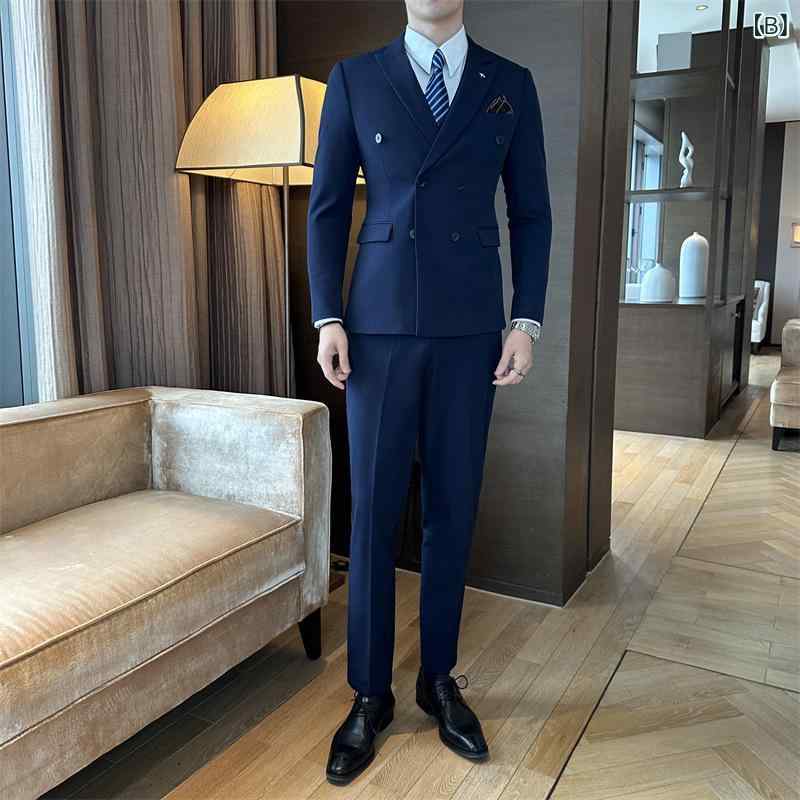 ・対象層: 24~35歳向け・前合わせ: ダブル2つボタン・生地: 化学繊維混紡・主な素材: ビスコース30%・着用シーン: カジュアル・襟型: ピークドラペル・ベント: サイドベンツ・シルエット: スリムフィット・厚さ: 普通・デザイン詳細: 金属装飾・カラー展開: ブラック、ネイビー、ミディアムグレー、ライトグレー、ダークグレー、カーキ・サイズ展開: S、M、L、XL、2XL、3XL、4XL、5XL、6XL、7XL・スタイル: ライトビジネス・仕立て: 接着芯地・機能: 防シワ