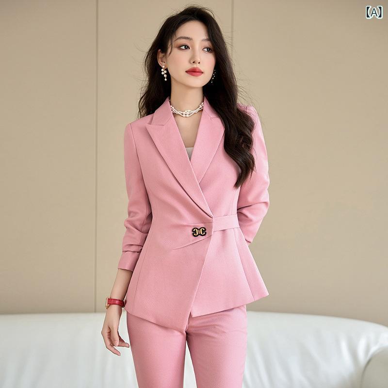 ・カテゴリ: カジュアルセットアップ・スタイル: きれいめ、エレガント、通勤・性別: レディース・主な素材: ポリエステル95%以上・パンツ丈: フルレングス・袖丈: 長袖・袖のタイプ: レギュラー袖・柄: 無地・装飾: 立体装飾・加工: 高温定形・セット内容: パンツスーツ・カラー展開: ピンク、ネイビー、ブラック・サイズ展開: S、M、L、XL、XXL、XXXL、XXXXL