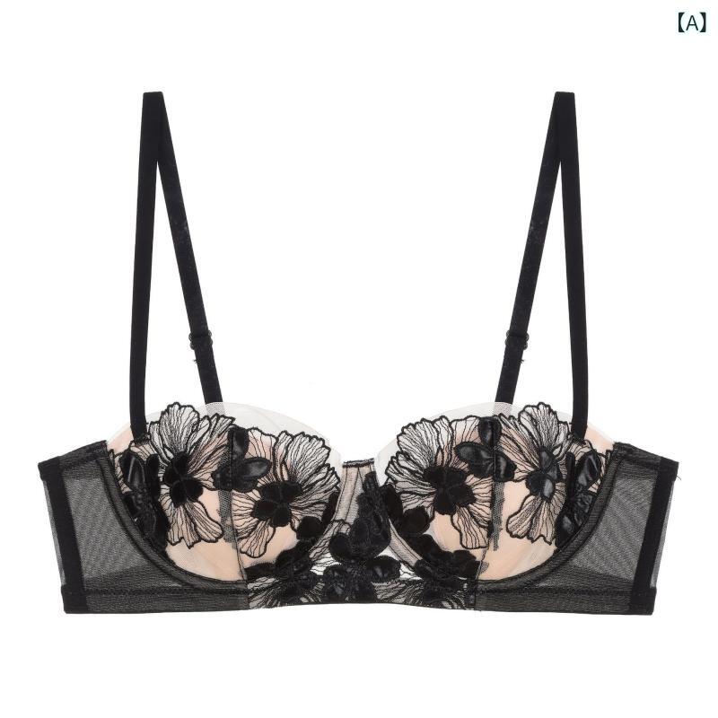 ・生地名: レース・カップ形状: 1/2カップ・モールドカップ: 薄手・対象年齢: 青年層(18~40歳)・主な素材: ナイロン90%・裏地素材: スパンデックス10%・ホック: 後ろ2段ホック・ストラップ: 固定ダブルストラップ・ストラップ素材: ナイロン、またはライクラ・スタイル: フレンチスタイル・デザインの特徴: 刺繍、レーストリム・機能: 寄せ上げ、通気性、バストアップ、快適、脇高、グラマーに見せない・適した季節: 夏、冬、春、秋・カラー展開: ブラック(トップス)、ホワイト(トップス)、ブルー(トップス)、ブラック(セットアップ)、ホワイト(セットアップ)、ブルー(セットアップ)・サイズ展開: 70B、75B、75C、80B、80C、85B、85C