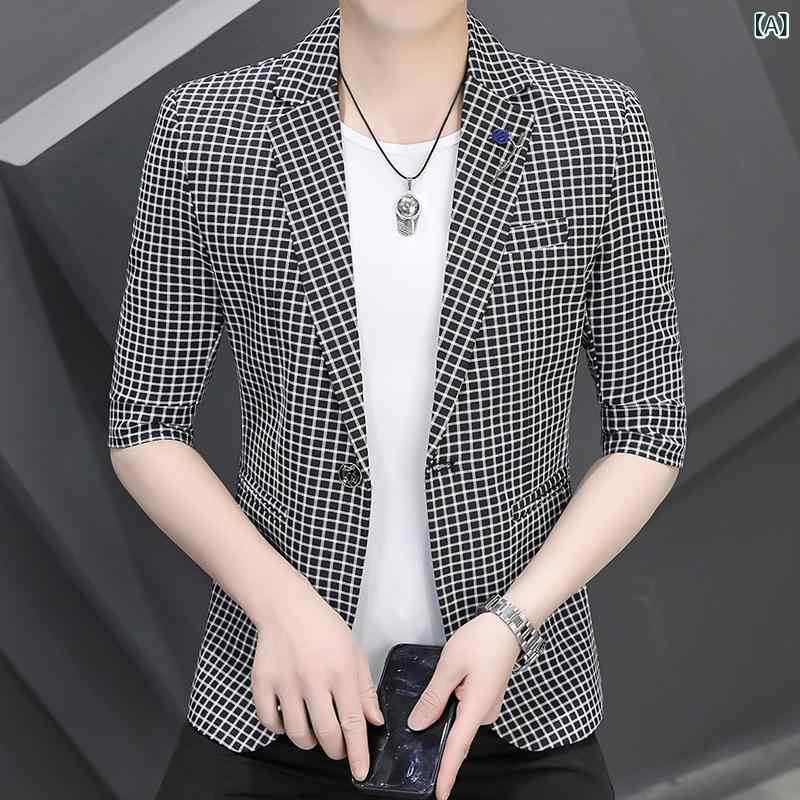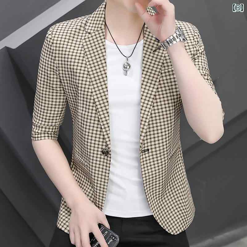 ・カテゴリ: カジュアルジャケット・フィット: スリム・襟型: テーラードカラー・フロント: シングル1ボタン・スタイル: ブリティッシュ・柄: チェック・主な素材: ポリエステル100%・着用シーン: デイリー・対象: 若年層・加工: 防シワ加工・デザイン: ポケット装飾・着丈: レギュラー・袖丈: 五分袖・ポケット: 玉縁ポケット・カラー展開: ブラック、カーキ・サイズ展開: M、L、XL、XXL、3XL・裾デザイン: ラウンドヘム・性別: メンズ
