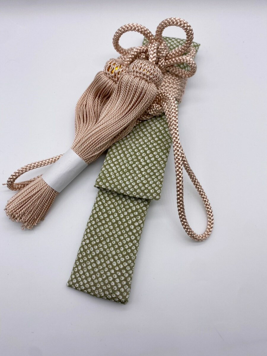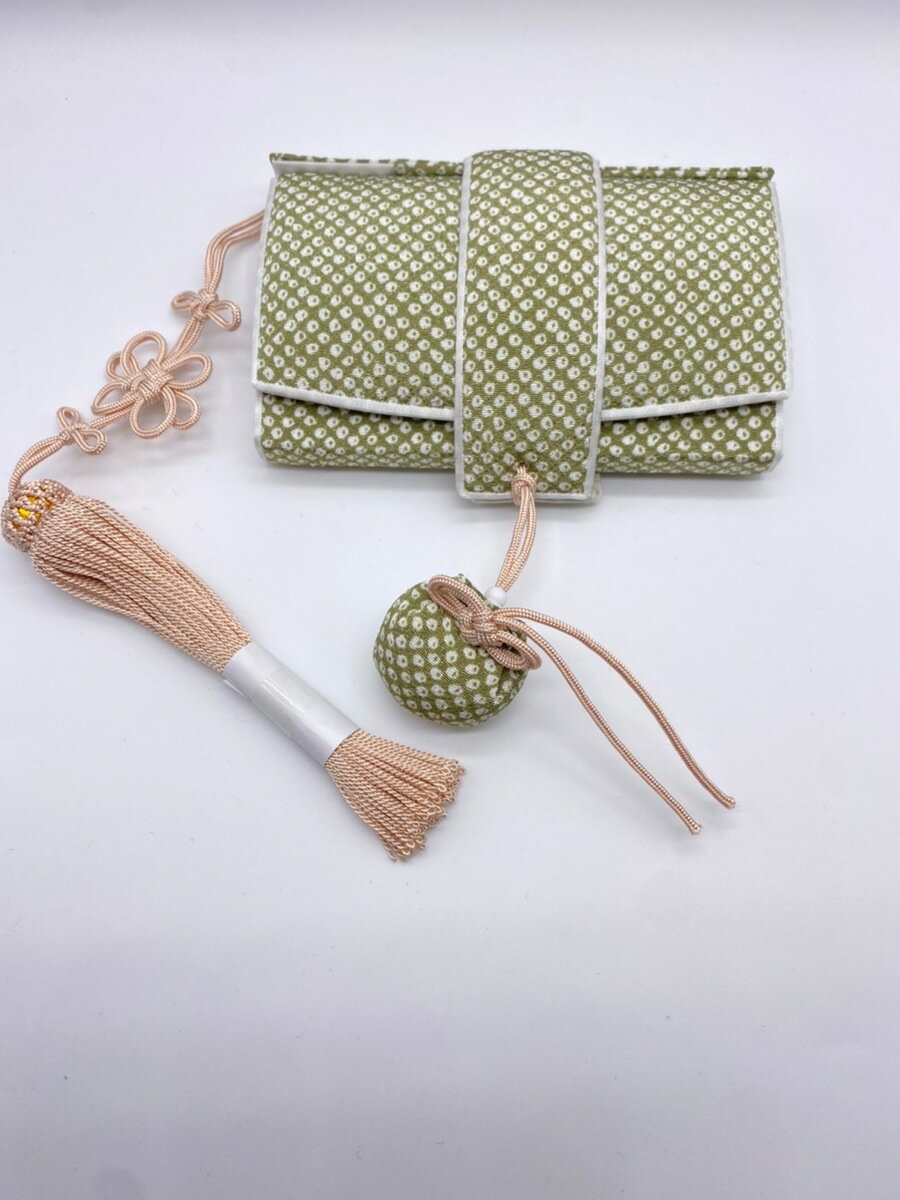 【送料無料】花嫁和装 はこせこ5点セットはこせこ かいけん 帯締め 抱帯 扇子 新品 婚礼用 疋田柄 くすみグリーン系 房ベージュ ポイント