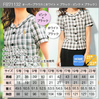 ※FB71132-1オーバーブラウス●春、夏●素材:サラクールチェック、ポリエステル100%●サイズ:5号(肩幅/37、袖丈/18、着丈/49.5、胸囲/88)、7号(肩幅/38、袖丈/19、着丈/50.5、胸囲/92)、9号(肩幅/39、袖丈/20、着丈/51.5、胸囲/96)、11号(肩幅/40、袖丈/21、着丈/52.5、胸囲/100)、13号(肩幅/41、袖丈/21、着丈/53.5、胸囲/104)、15号(肩幅/42、袖丈/21、着丈/54.5、胸囲/109)、17号(肩幅/43、袖丈/21、着丈/54.5、胸囲/115)、19号(肩幅/44、袖丈/21、着丈/55.5、胸囲/121)、21号(肩幅/44、袖丈/21、着丈/55.5、胸囲/127)、23号(肩幅/44、袖丈/21、着丈/55.5、胸囲/133)●カラー:ホワイト×ブラック、ピンク×ブラック商品仕様●いつでもさわやか新素材スタイル(サラクールチエック)●涼しくて紫外線防止効果。