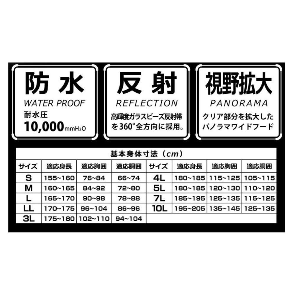 ■適応身体:●身長:175〜180cm●胸囲:102〜110cm●胴囲:94〜104cm 重量/容量 おすすめ ●高輝度ガラスビーズ反射帯を360度全方向に採用●クリア部分を拡大したパノラマワイドフード●尻部無縫製仕様●ベンチレーション 仕様 ●耐水圧:10000mm/H2O(JIS L 1092 B法)