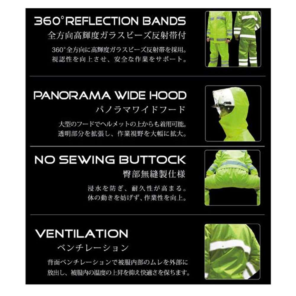 ■適応身体:●身長:170〜175cm●胸囲:96〜104cm●胴囲:86〜96cm 重量/容量 おすすめ ●高輝度ガラスビーズ反射帯を360度全方向に採用●クリア部分を拡大したパノラマワイドフード●尻部無縫製仕様●ベンチレーション 仕様 ●耐水圧:10000mm/H2O(JIS L 1092 B法)