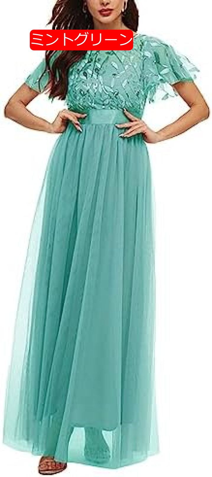 【新しいタイトル】: "華やかなレース切替ロングドレス!袖ありスイングワンピース、スパンコール使いで高級感溢れるイブニングドレス!大きいサイズ対応、二次会やお呼ばれにも最適!"1. Aラインデザインで女性らしいシルエットを演出!腰周りをカバーしながら、美脚効果も抜群のワンピース。