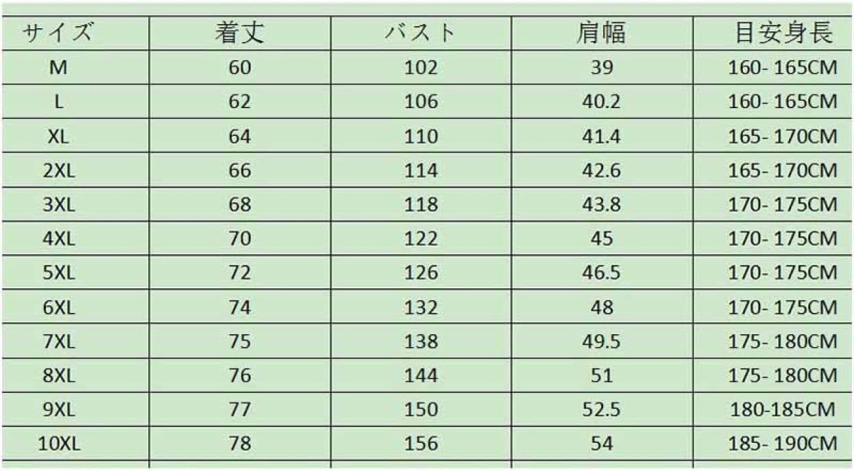 説明 ★詳しいサイズ(cm): ● L(cm):肩幅42.5、胸囲100、着丈65 ● XL(cm):肩幅43、胸囲104、着丈67 ● 2XL(cm):肩幅45、胸囲108、着丈69 ● 3XL(cm):肩幅46、胸囲112、着丈71 ● 4XL(cm):肩幅47、胸囲116、着丈71 ● 5XL(cm):肩幅48、胸囲120、着丈73 ● 6XL(cm):肩幅49.5、胸囲124、着丈75 ● 7XL(cm):肩幅50.5、胸囲128、着丈76