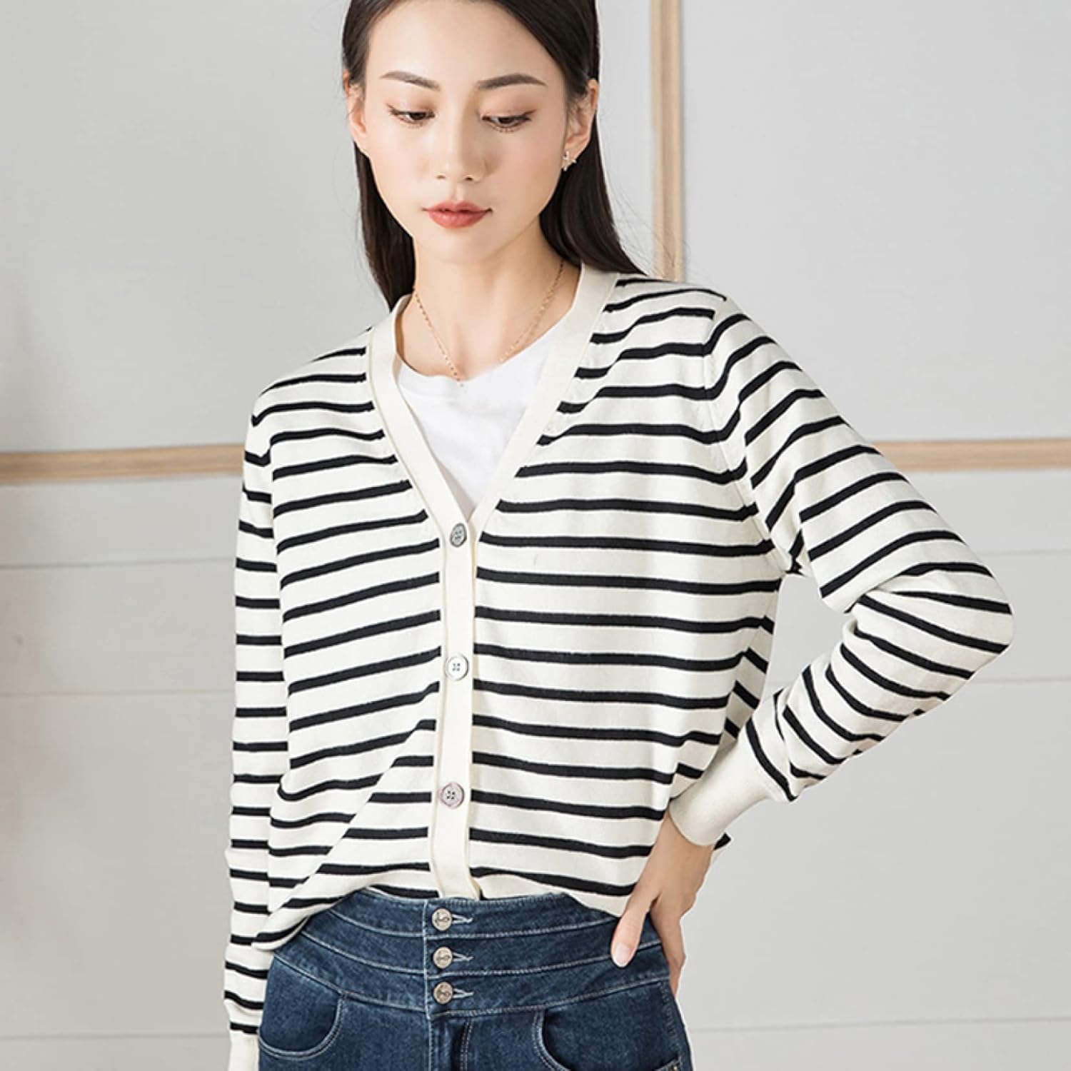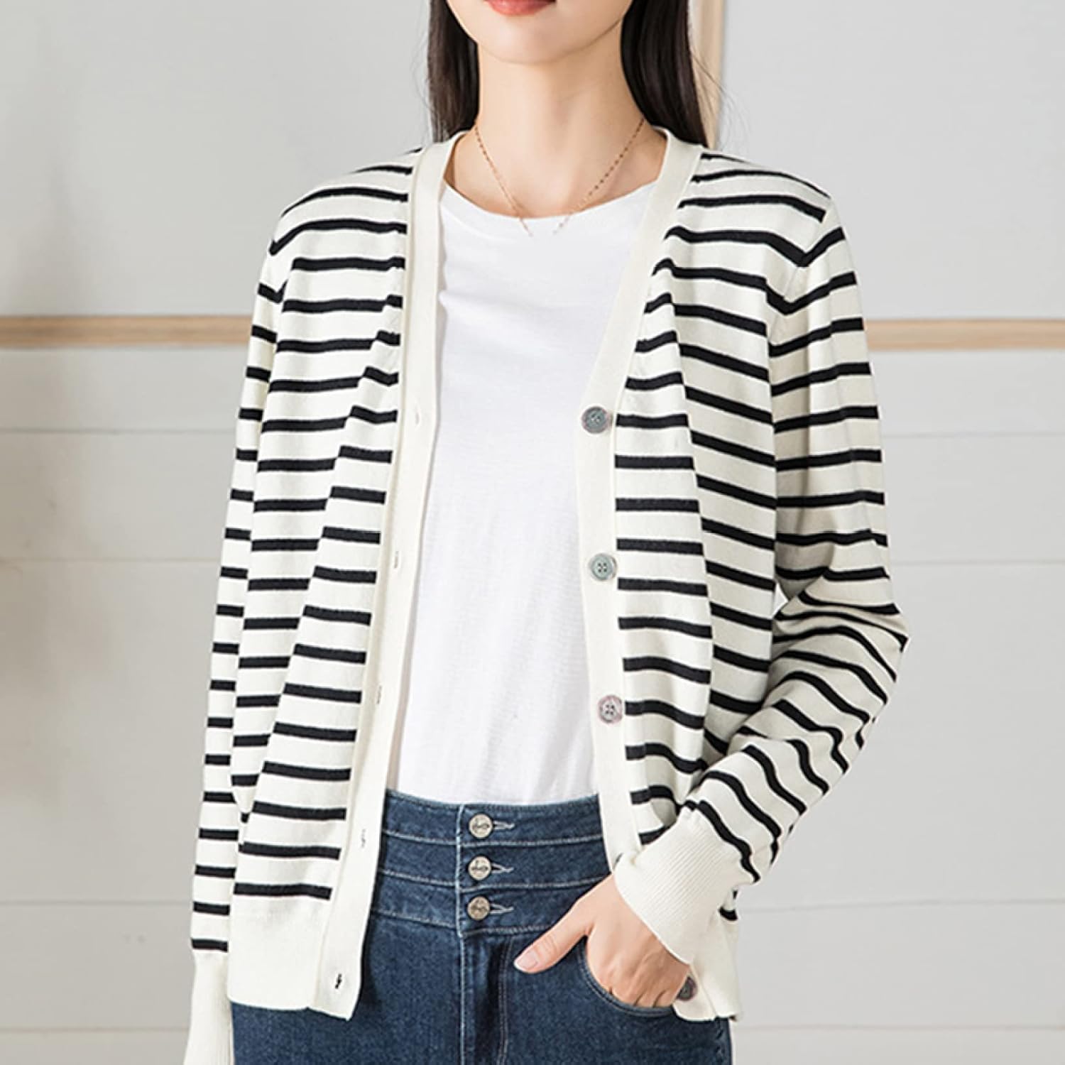人気のカーディガンでボタンは全部閉めてもいいし、開けて着てもキマリます。