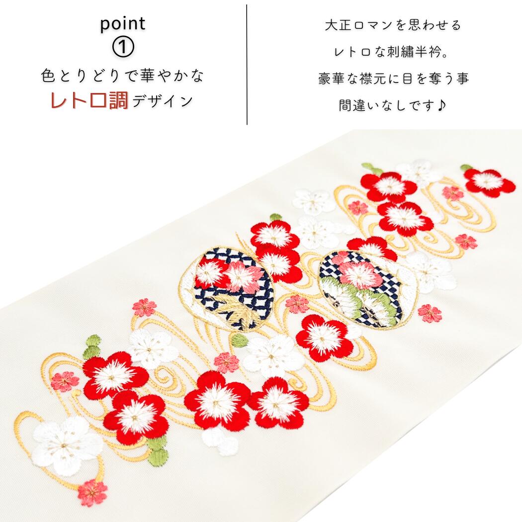 商品説明 特徴 上質な生地に梅、流水、貝合わせなどの古典模様の刺繍を施した刺繍半襟です。