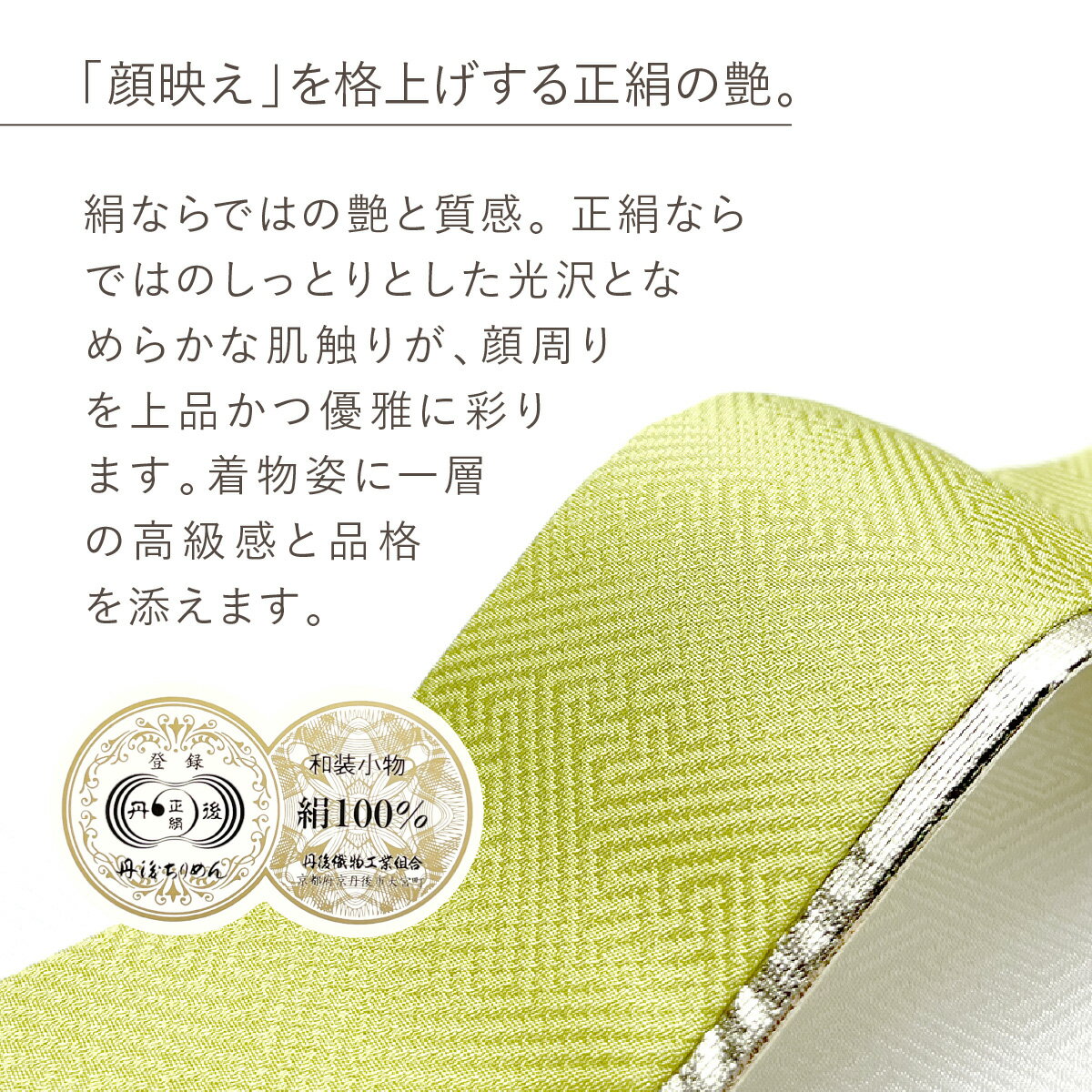 正絹ならではのしっとりとした光沢となめらかな肌触りが、顔周りを上品かつ優雅に彩ります。