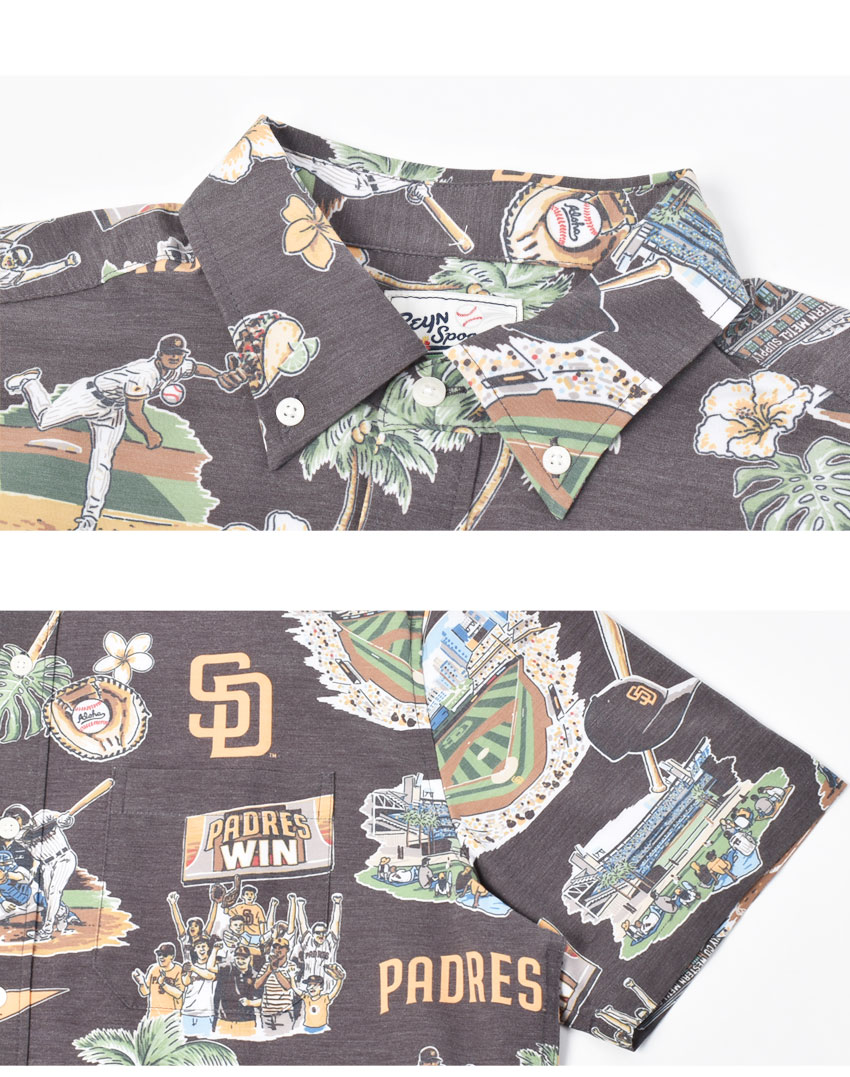 サンディエゴ・パドレスの象徴的なチーム要素、スタジアムのシーン、ロゴがクラシックなアロハと融合しており、試合の日、オフィス、またはカジュアルな外出に快適に着こなすことができます。
