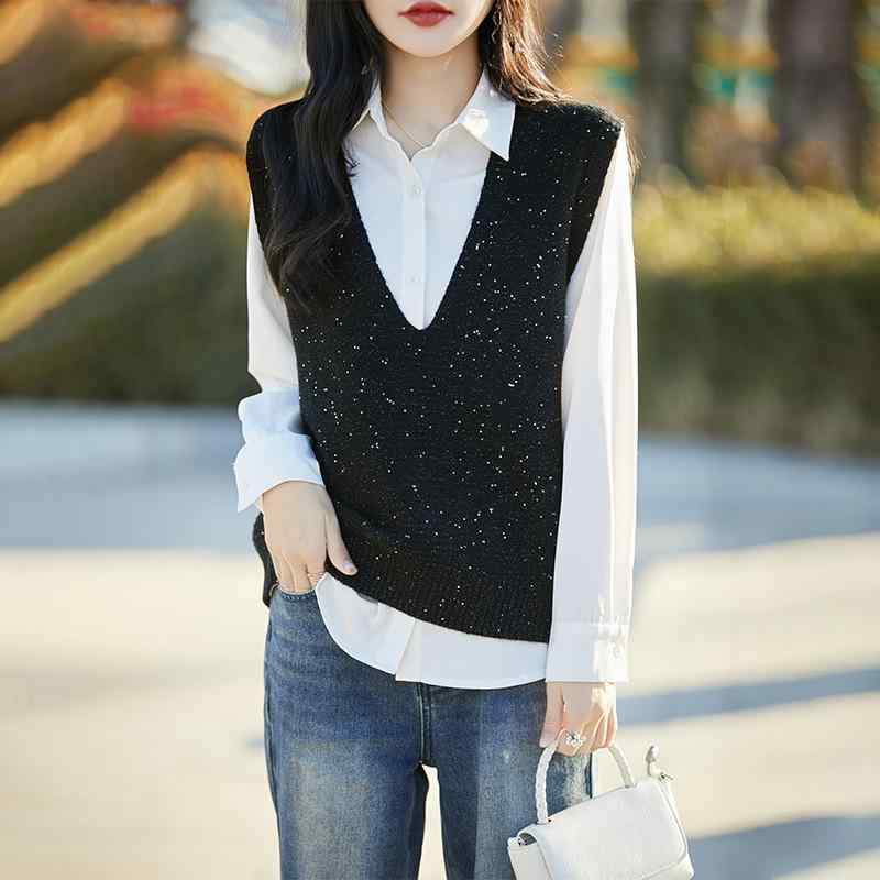 ニット レディース 猫柄 Vネック レトロ ベスト ゆったり 焦糖色 藏青色 赤色 トッ...