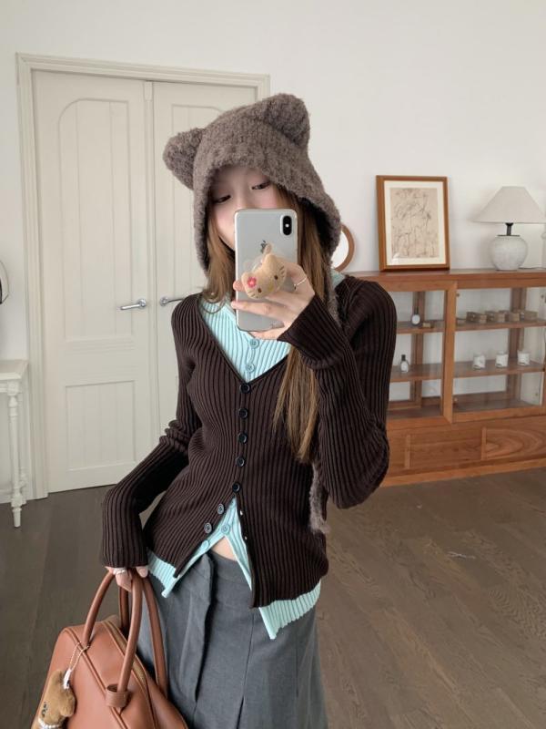 カーディガン レディース ニット 長袖 秋 トップス 配色 ダブルジップ コットン 接...