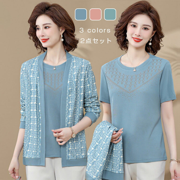 送料無料 カーディガン レディース アンサンブル 中高年 カットソー 2点セット ジ...