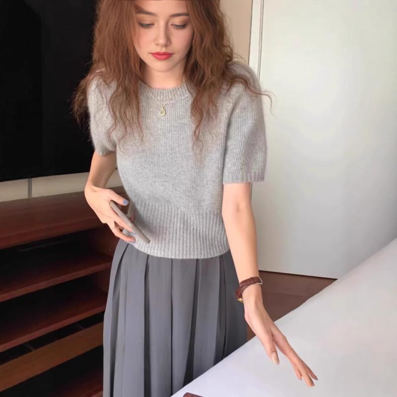 ニット レディース 春秋 Tシャツ 半袖 ラウンドネック ウール ゆったり スリム 薄...
